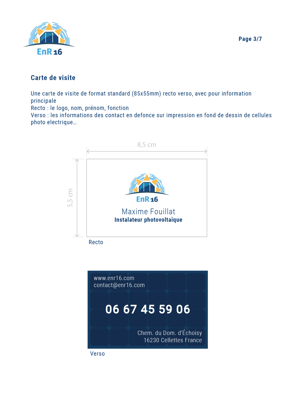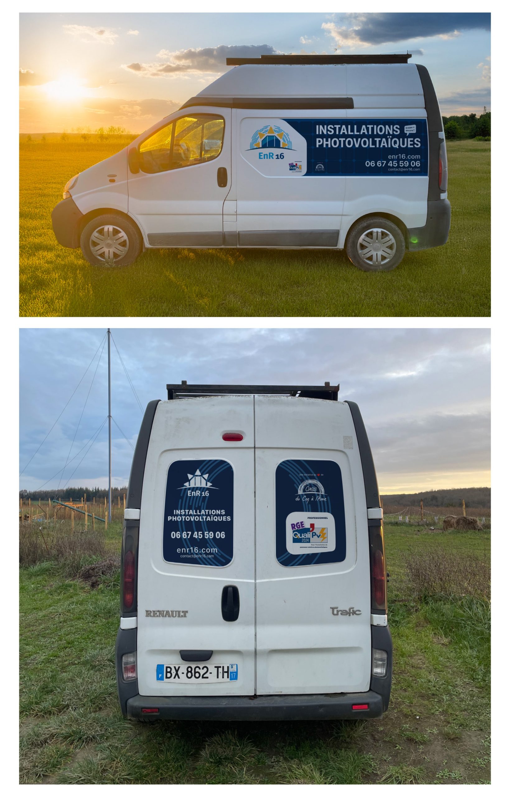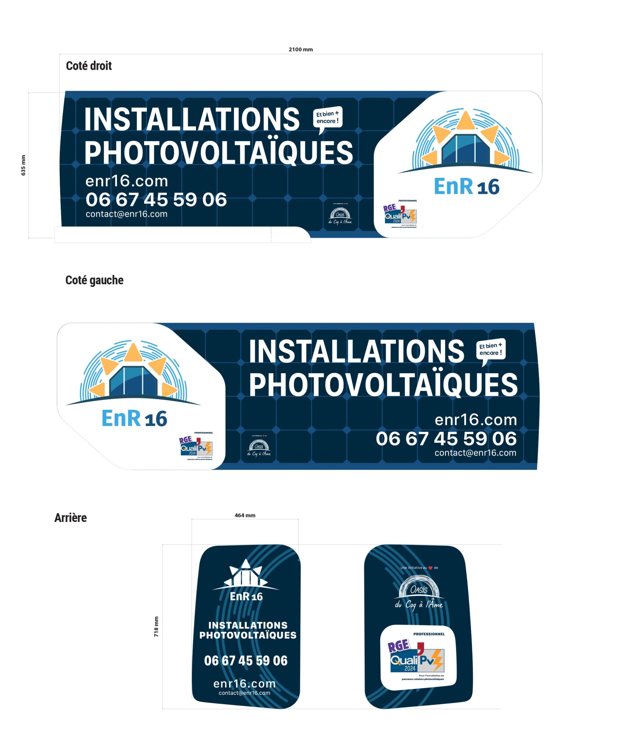 Conception de l'identité globale d'Enr16, filiale photovoltaïque de l'Oasis. Du logo au flocage des camions, une image professionnelle ancrée dans la transition énergétique et le territoire.