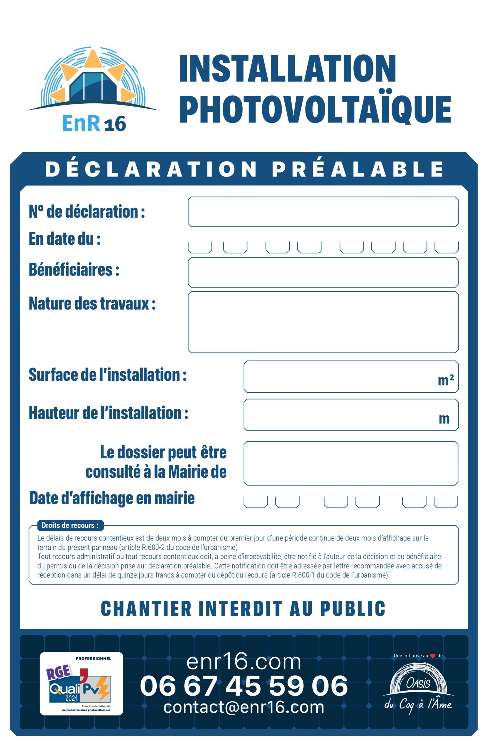 - Client / contexte : Enr16, filiale SAS de la SCIC Oasis du Coq à l’Âme. Installation photovoltaïque en Nouvelle-Aquitaine.